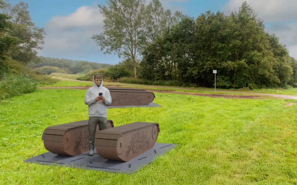 Een tweede markant element op de Accesroute zijn de TankTracks. Deze cor-ten stalen objecten maken in een oogopslag duidelijk dat de plek en de watergang iets met tanks te maken heeft. In de tracks komen teksten en afbeeldingen van planten en dieren die met verdedigen en camoufleren te maken hebben.