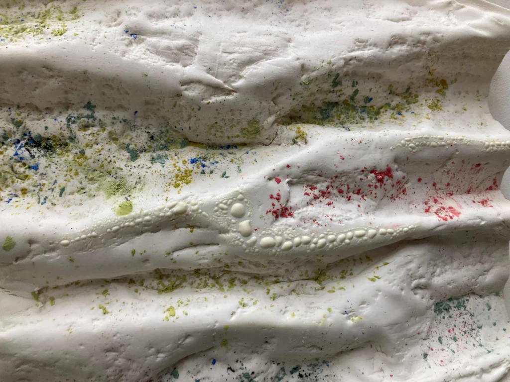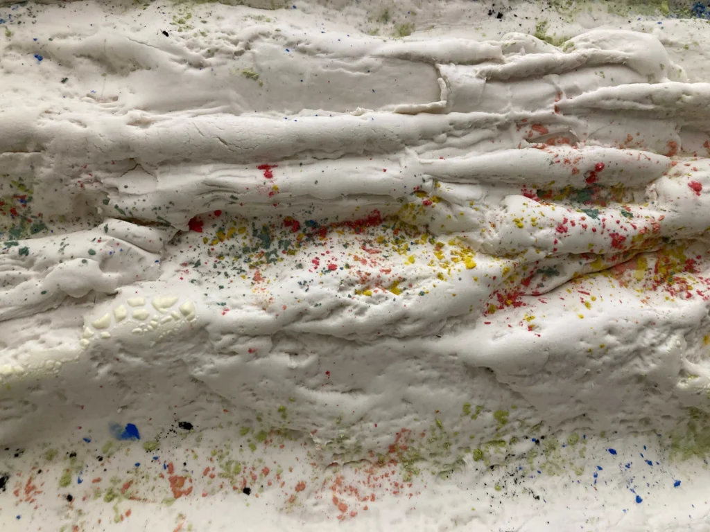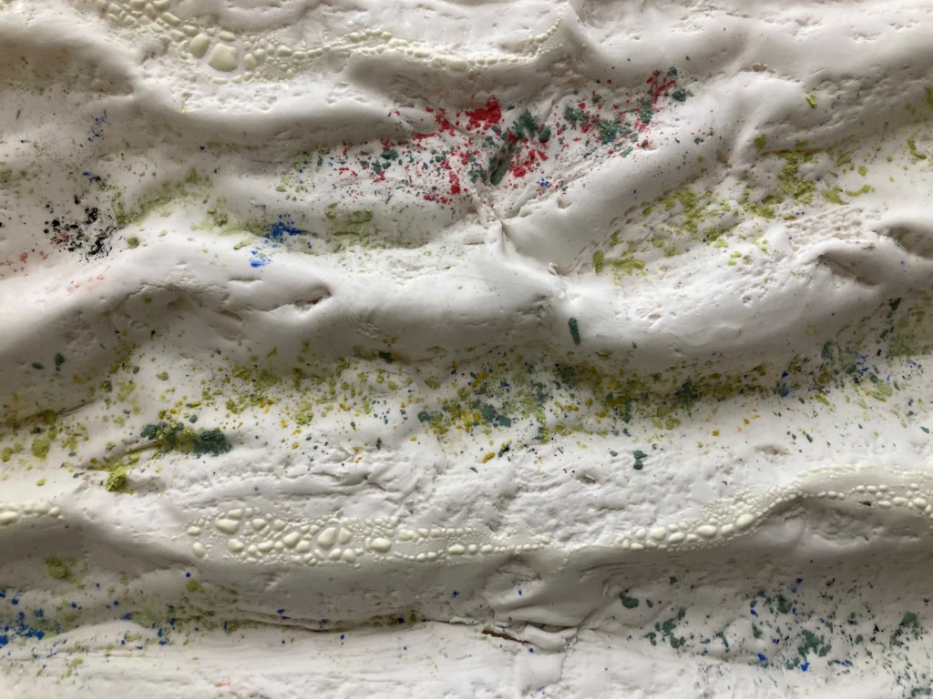 Na de witte serie is er ook een serie gemaakt met kleur structuren. Met verschillende kleuren porselein- en druppelglazuren zijn kleuren op de witte porseleinen ondergrond gemaakt. Dit wandobject bestaat uit één strook met vier tegels.