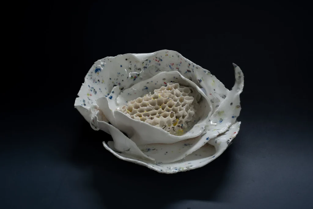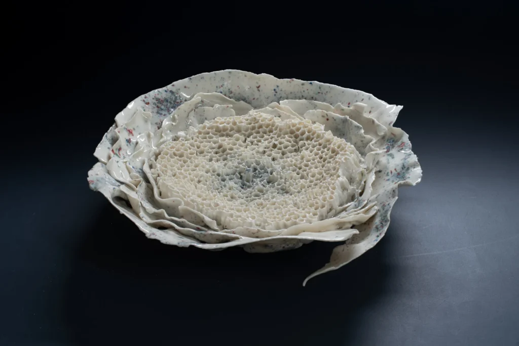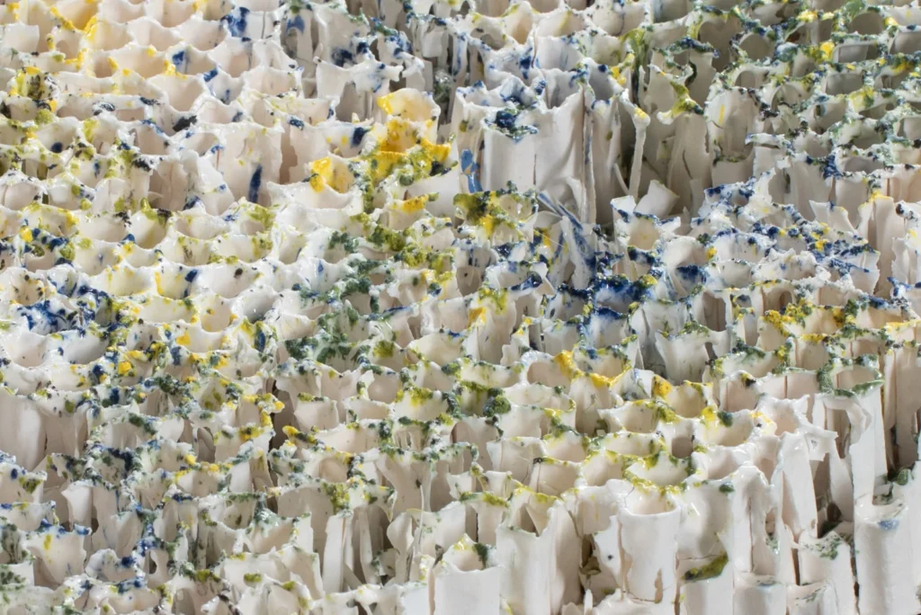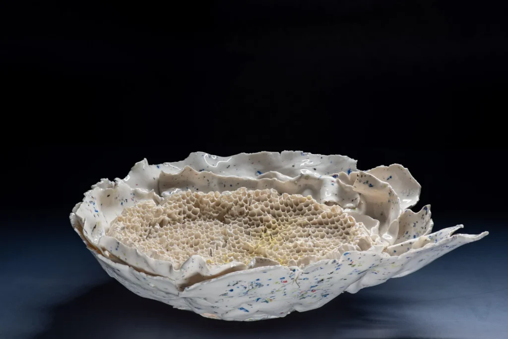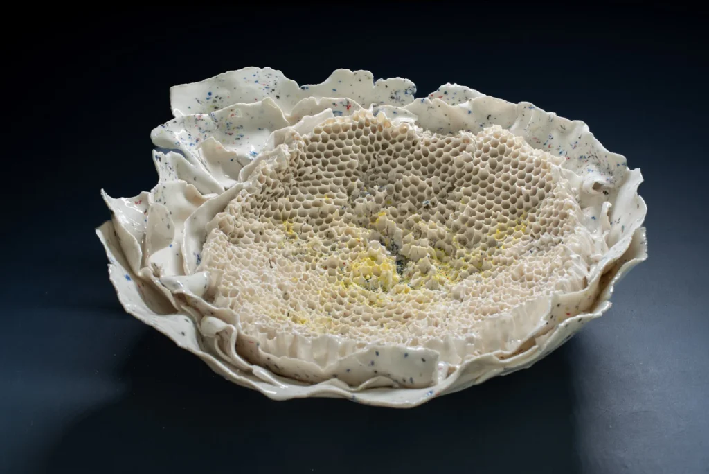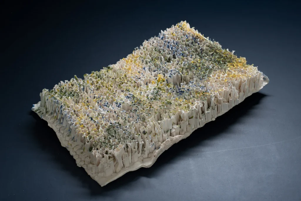 Yellow Hornetcomb; Porselein object van Yellow legged hoornaar raat , wit en geel porseleinslib, 30 x 25 cm, gereserveerd voor XXXIII Concorso di Ceramica Contemporanea “Mediterraneo” in Grottaglie, Italië (4 juli-18 oktobe 2026).