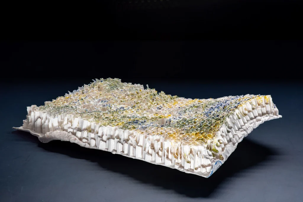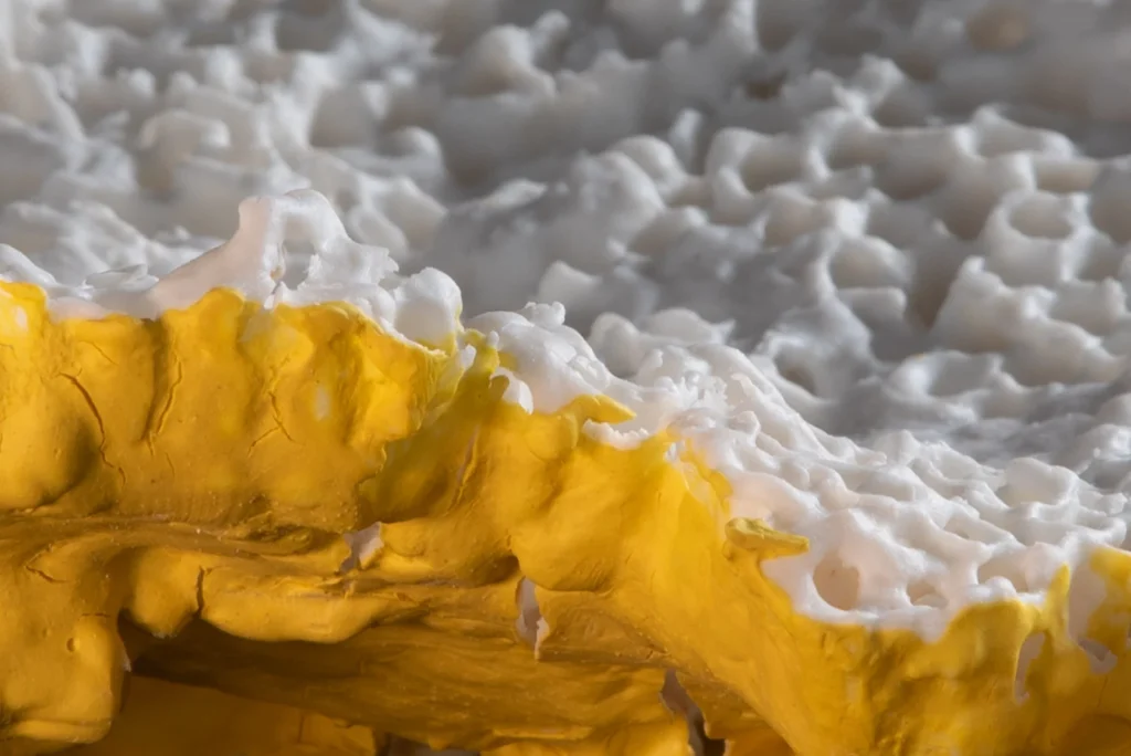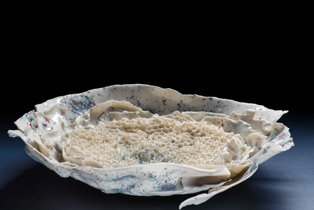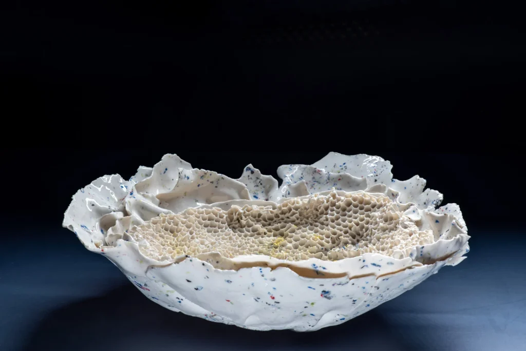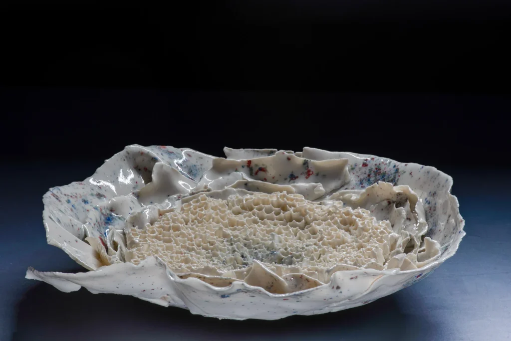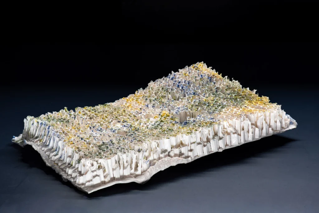 Yellow Hornetcomb; Porselein object van Yellow legged hoornaar raat , wit en geel porseleinslib, 30 x 25 cm, gereserveerd voor XXXIII Concorso di Ceramica Contemporanea “Mediterraneo” in Grottaglie, Italië (4 juli-18 oktobe 2026).