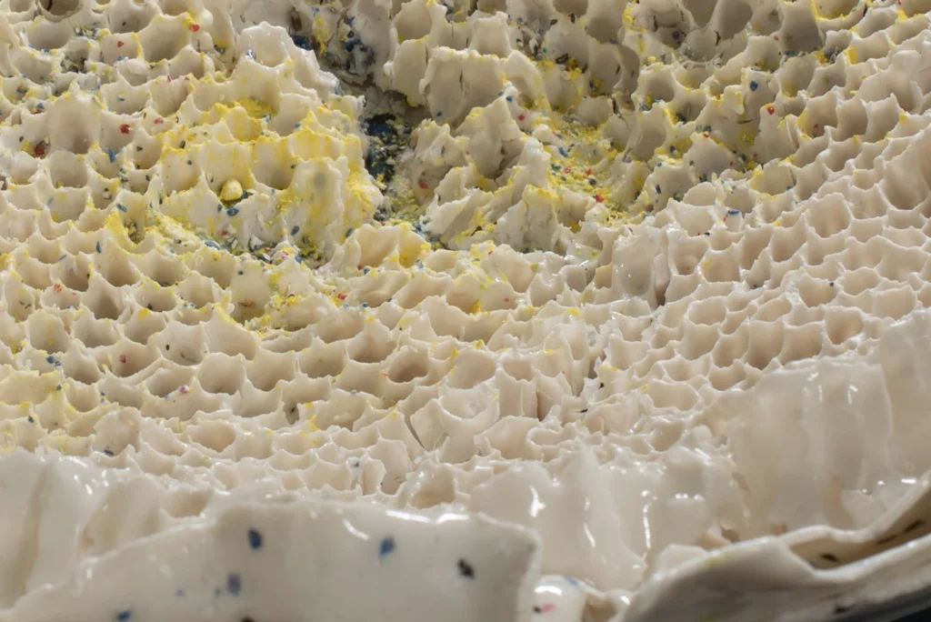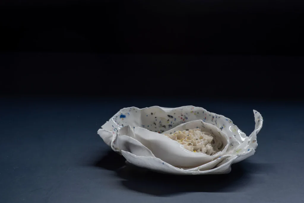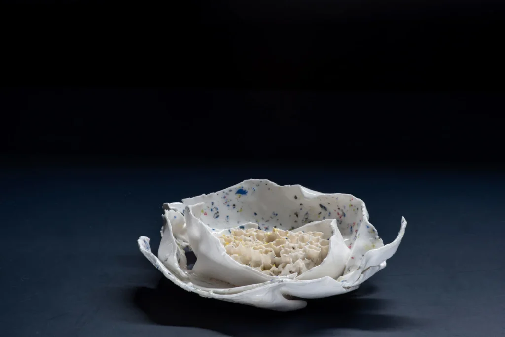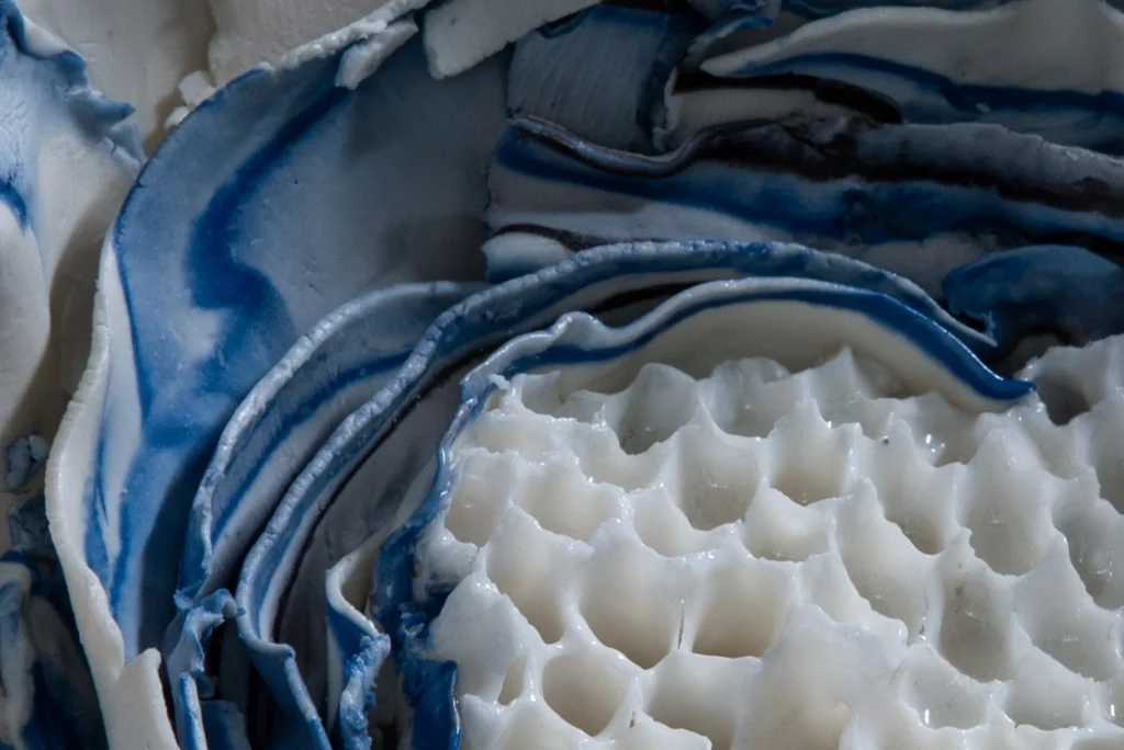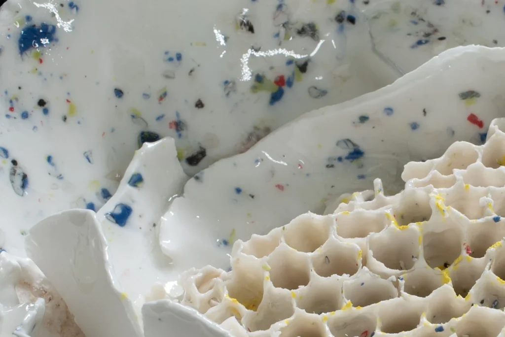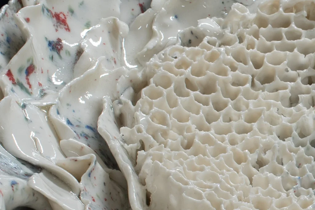 Yellow Hornetcomb; Porselein object van Yellow legged hoornaar raat , wit en geel porseleinslib, 30 x 25 cm, gereserveerd voor XXXIII Concorso di Ceramica Contemporanea “Mediterraneo” in Grottaglie, Italië (4 juli-18 oktobe 2026).